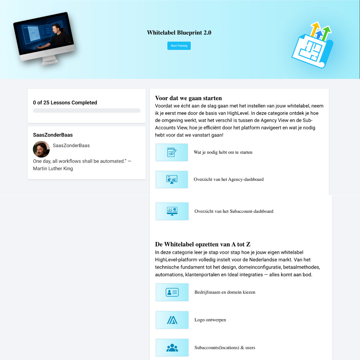 Met de Whitelabel Blueprint 2.0 zet je jouw volledige HighLevel-omgeving stap voor stap op — compleet Nederlandstalig, superhelder uitgelegd en direct toepasbaar. Geen urenlang zoeken naar instellingen. Geen gokwerk.